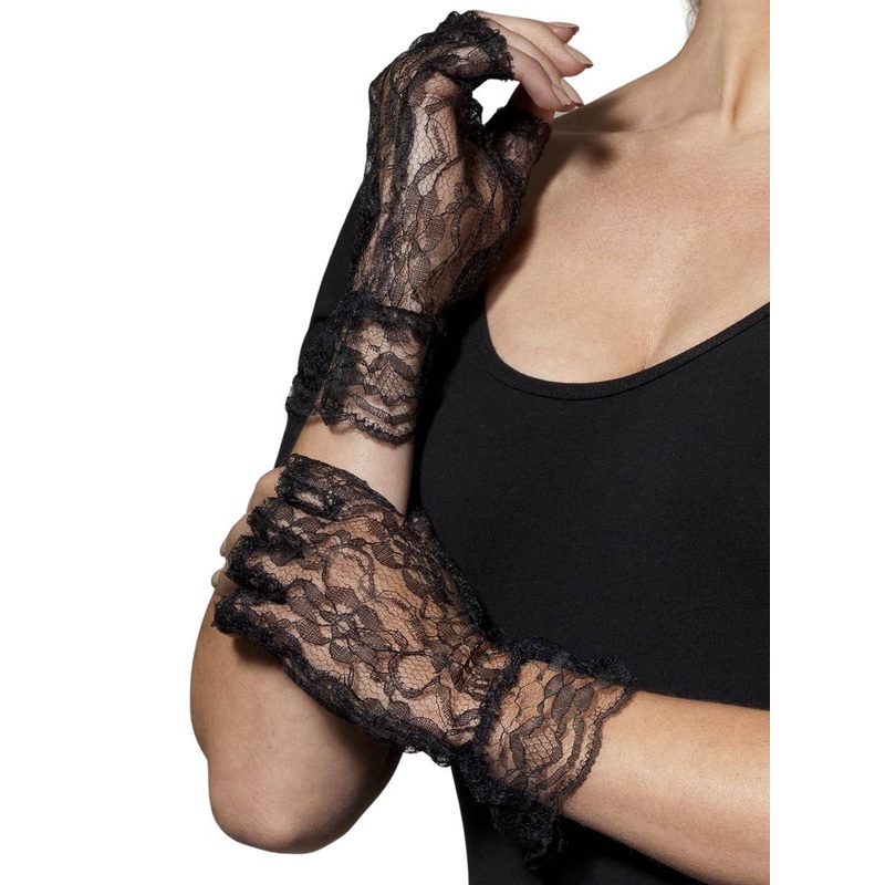 Short Black Lace Wrist GlovesStunning and elegant womens black lace gloves dress up costume accessory. Ideal black gloves to complete your burlesque themed fancy dress costume or 1980'sthemed dress up.Description:Black lace gloves with elastic around the w