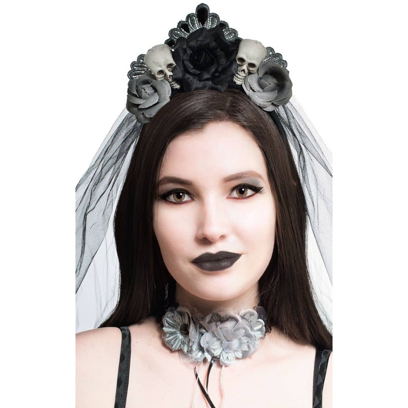 Womens Grey Floral Gothic Bride Skull Veil HeadbandThis costume headband is the perfect accessory to complete a gothic bride look! Whether you're headed out to a costume party or going trick or treating, this veil headband will add the right touch of gothi