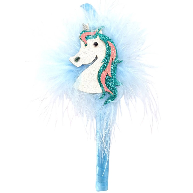 Girl's Blue Glittery Fluffy Unicorn Costume HeadbandDescription:Blue unicorn headband is made from bendable plastic and wrapped with light blue ribbon.Attached to one side of the headband is a white felt unicorn head side profile.The unicorn is covered wit