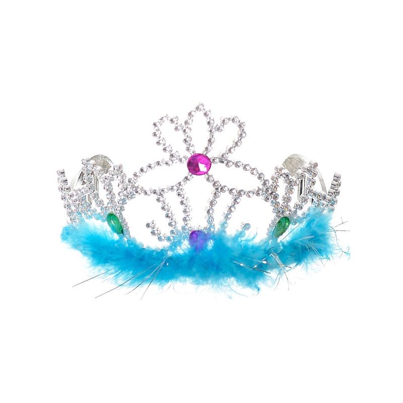 Sky Blue Feather Princess Costume Tiara With Faux GemstonesDescription:Costume tiara is made with moulded silver plastic with decorative swirl patterns creating the tiara outline.The tiara sits on an attached headband and features faux rhinestone detailing