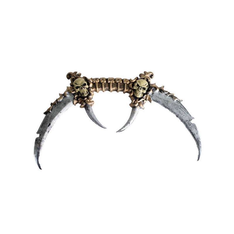• The weapon has gold coloured handle in the middle with skulls.