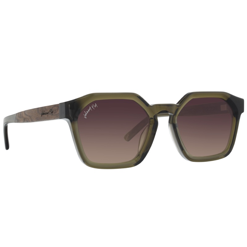 This cutting edge design features our concave cut design, created with an acetate front section, layered wooden arms, spring hinges, and nylon polarized lensing that make them Johnny Fly.