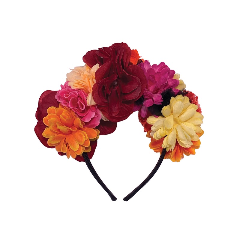 Bright Floral Costume HeadbandIncludes:HeadbandDescription:Headband is covered in black material.Attached to the top are red, pink, yellow and peach coloured faux flowers.One size fits most.Flower headband styling tips:Wear this flower crown with your hipp