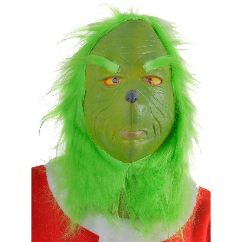 Furry Green Christmas Hater Costume MaskDescription:Full head mask is made with green rubber latex.The mask's hood is made from neon green faux fur material and features an open V-shaped back that stops at the base of the crown for easy and comfortable wea