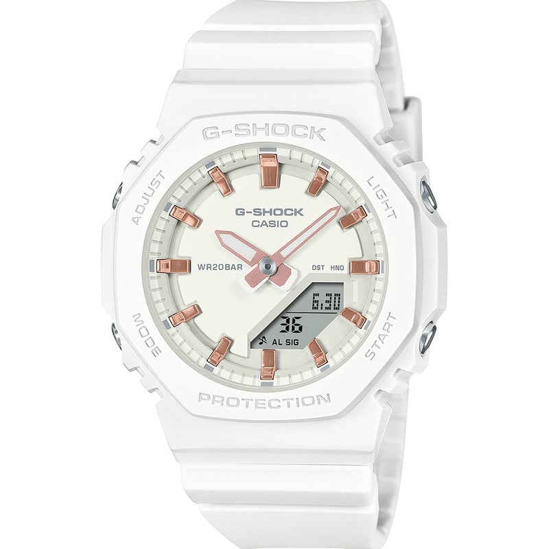 Explore three elegant new colour variations of the popular GMA-P2100 analog-digital model, each featuring pink-gold vapor-deposited hour markers that add a radiant, refined touch.Crafted with a compact case, these timepieces offer a comfortable fitperfect for slender wristswhile maintaining a stylish, modern look. The bio-based resin bands, made from renewable materials, highlight G-SHOCKs continued commitment to sustainability.Balancing subtle sophistication with timeless design, these watches bring a touch of brilliance to any ensemble, making them a versatile accessory for every occasion.- Module No. 5730- 46.0 x 40.2 x 11.2mm Case Size – 40g Weight – Shock resistant (G-SHOCK)- Double LED light*LED light for the face (Super Illuminator, selectable illumination duration (1.5 seconds or 3 seconds), afterglow) *LED backlight for the digital display (Super Illuminator, selectable illumination duration (1.5 seconds or 3 seconds), afterglow)- Hand shift feature (Hands move out of the way to provide an unobstructed view of digital display contents)- World time: 31 time zones (48 cities + coordinated universal time), daylight saving on/off- 1/100-second stopwatch- Countdown timer- 5 daily alarms- Hourly time signal- Full auto-calendar (to year 2099)- 12/24-hour format- Button operation tone on/off- Regular timekeeping*Analog: 2 hands (hour, minute (hand moves every 20 seconds))*Digital: Hour, minute, second, pm, month, date, day- Accuracy: 15 seconds per month- Approx. battery life: 3 years on CR1025