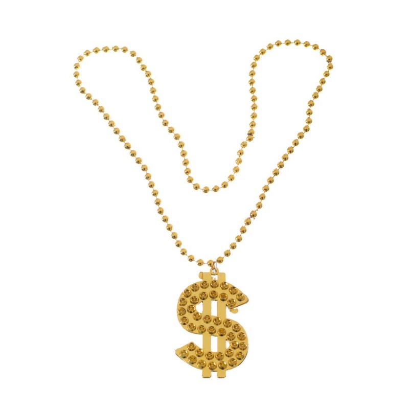 Be ready to show them who the real Mac Daddy is at your next fancy dress party! This plastic beaded metallic gold necklace with silver dollar sign charm is the ideal costume jewellery accessory to finish off a number of fancy dress costumes, including Mac Daddy Pimp, Gangster outfitsor a 90s themed dress up!