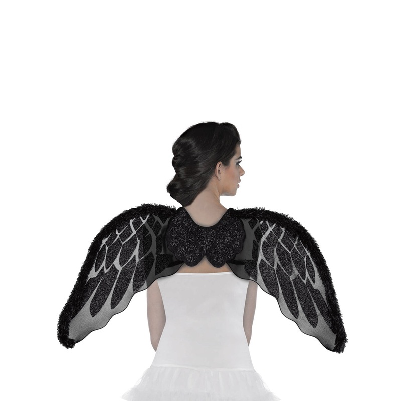 Black Glitter Dark Angel Costume WingsIncludes:WingsDescription:Wings are made from black mesh with black glitter feathers printed on.Around the top are black marabou feathers.In the centre is black felt with gold glitter details.Costume wings have elastic