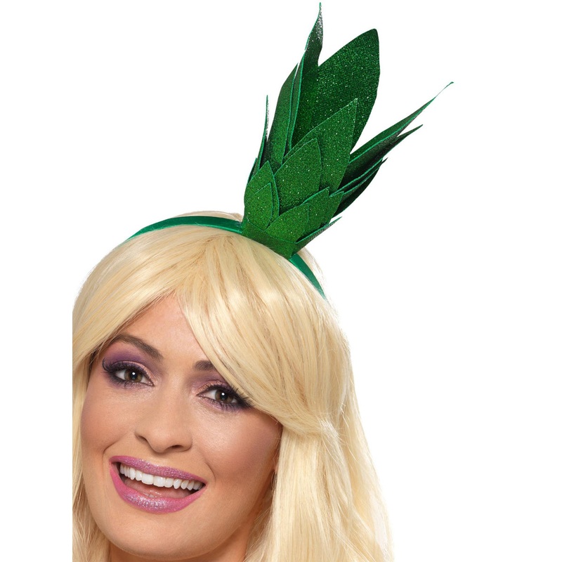 Green Glitter Pineapple Stalk Costume HeadbandIncludes:HeadbandDescription:Headband is covered in green satin material.Attached to the top are green glitter leaves to create a pineapple stalk.Pineapple stalk headband styling tips:This glitter pineapple sta