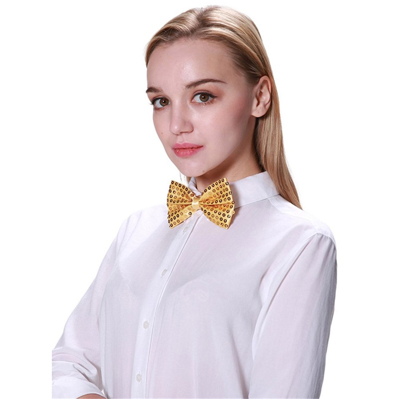 Gold Bowtie with SequinsFinish off your cabaret costume or circus outfit with this flashy gold sequinned bow tie! This costume tie is sure to make you shimmer under the spot light! Glam up your outfit with this super cool costume accessory!Description:This