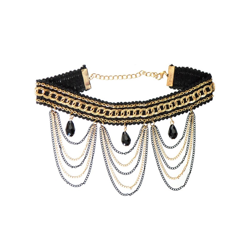 • 3 lots of black and bronze chains hang symmetrically around the choker with black tear drop jewels in the centre.