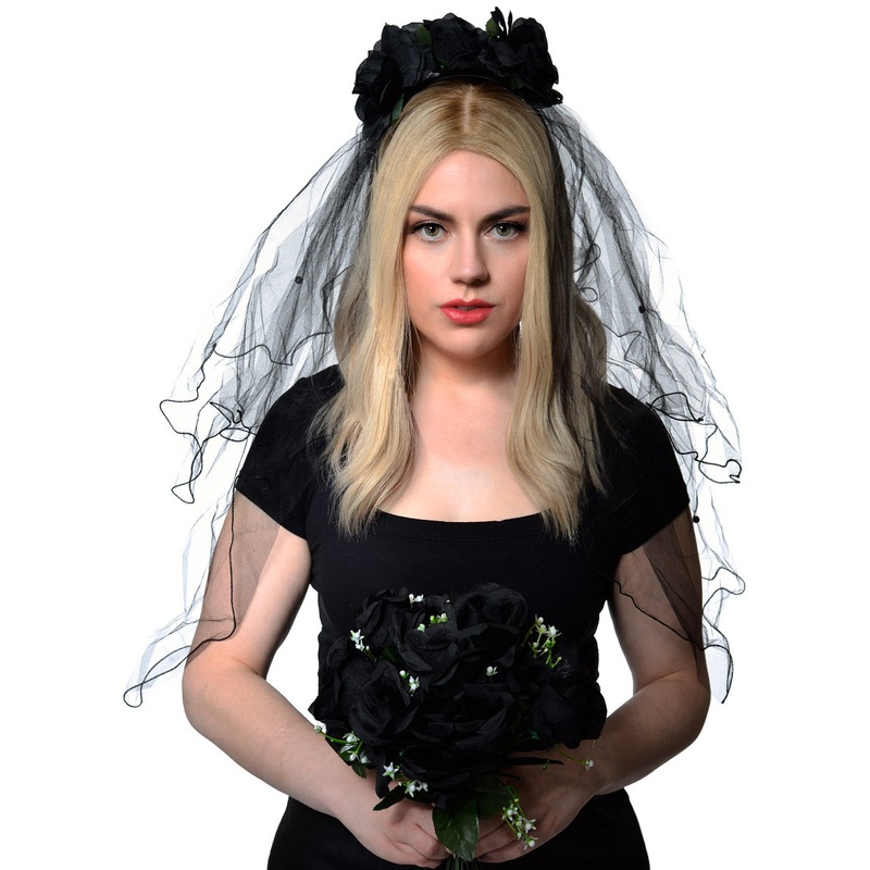 Black Rose Headband and Veil Halloween AccessoryFinish off your undead bride outfit with this super cool headband and veil accessory! This costume headband features black faux roses on top with a black veil. Pair this accessory with a bouquet of black rose