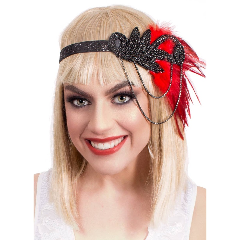 Black Rhinestone Flapper Headband with Red FeathersThere are flapper headbands and there are Gatsby headbands, this is the latter! Take a trip back to the 20s, a time known for glitz and glam, when the 'Roaring Twenties' we're alive and well and nothing co