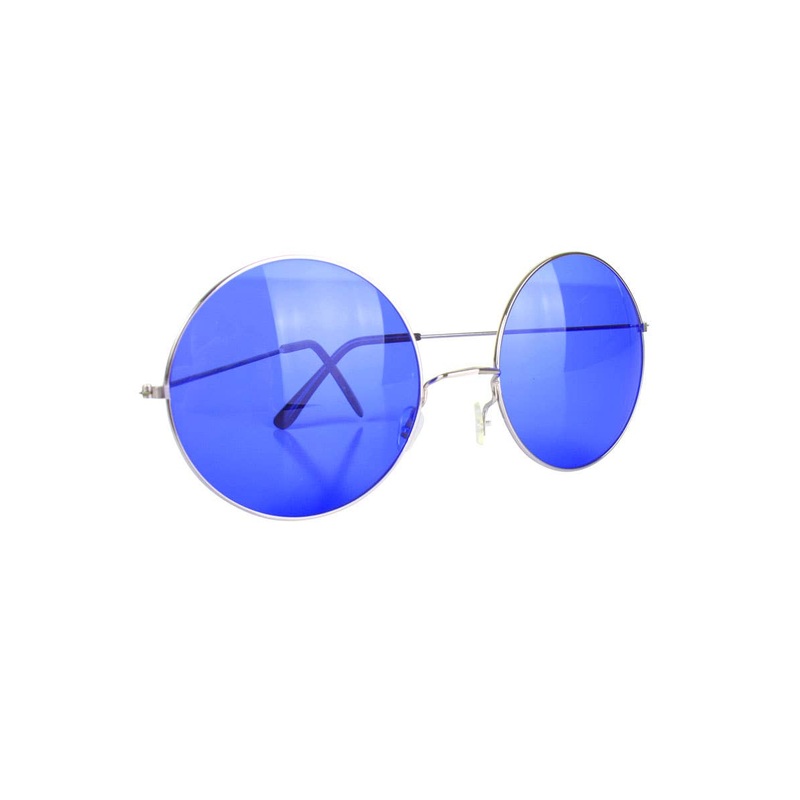 Blue Retro 1960's Round Costume GlassesIncludes:GlassesDescription:Glasses have silver frames and large blue lenses.Lenses measure approximately 6.5cm across, total width 16cm.One size fits most.How to style your hippie glasses:Pair these retro glasses wit