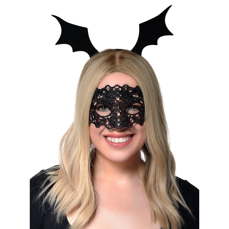 Black Lace Masquerade Mask and Bat Wings Headband Halloween SetGet ready for the spookiest night of the year with this black masquerade mask and bat wings headband set! This accessory set is sure to make you stand out at your upcoming Halloween dress up pa