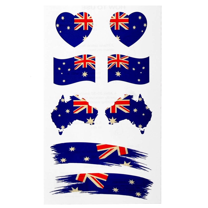 Hearts and Australian Flag Temporary TattoosIncludes:fake tattoosDescription:Temporary tattoo pack includes 8 tattoos and 4 designs.All designs feature the Australian flag in different shapes (hearts, flags, Australia, swipes).Instructions on how to use th