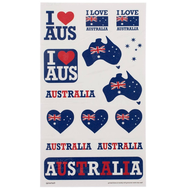 I Love Australia Aussie Flag Coloured TattoosIncludes:Tattoo SheetDescription:One sheet of temporary tattoos.Sheet features 14 tattoos in various designs.These designs include the Australian flag in the shape of a love heart and Australia, the Australian f