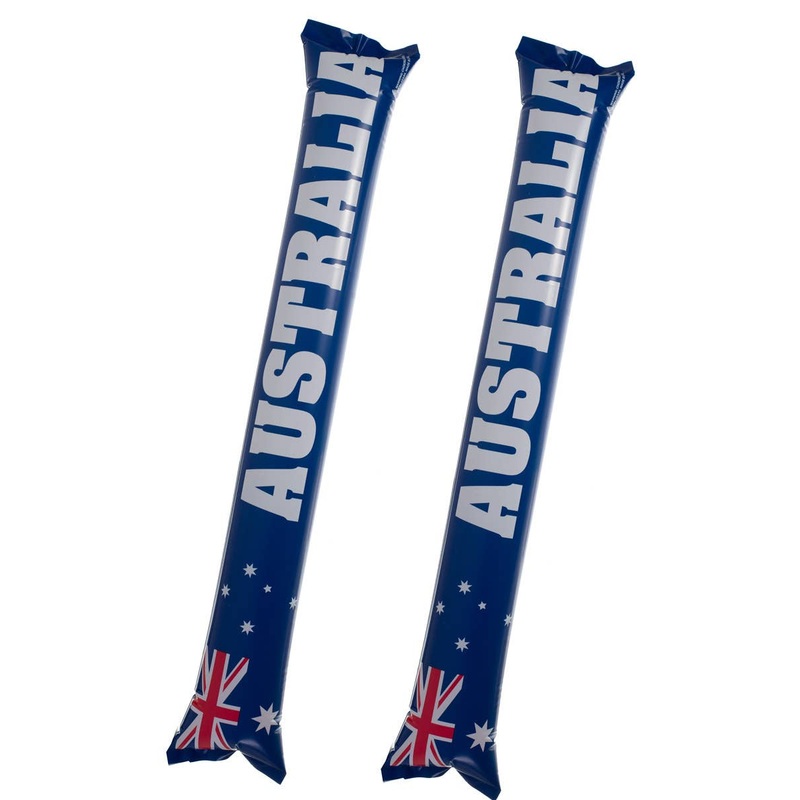 Inflatable Australia Day Cheer SticksIncludes:2 Inflatable cheer sticksDescription:Both cheer sticks are blue with the Australian flag and AUSTRALIA printed in white on both sides.When the cheer sticks are hit against each other, they make a loud noise.Che