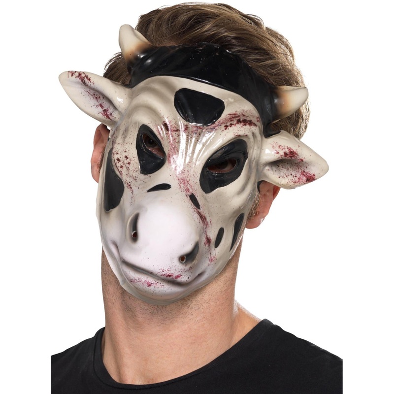 Adults Killer Cow Costume MaskIncludes:MaskDescription:Cow mask is made from white plastic and has an elastic band attached to the back.Mask features cow facial features including horns, ears, eyes, nose and mouth.Costume mask has black spots and blood spl