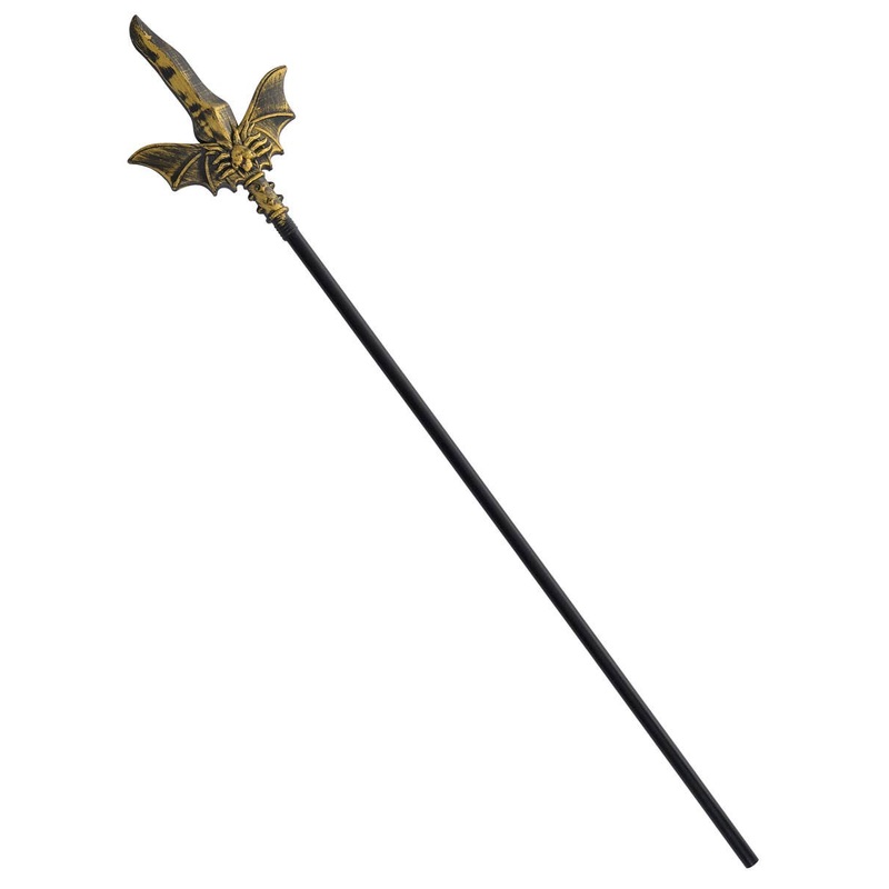 Black and Gold Medieval Costume Weapon SpearDescription:Medieval spear comes in two pieces.Long spear handle is made with black plastic piping.Spear head is made with black moulded plastic that is painted with a matte gold brush stroke finish that gives a