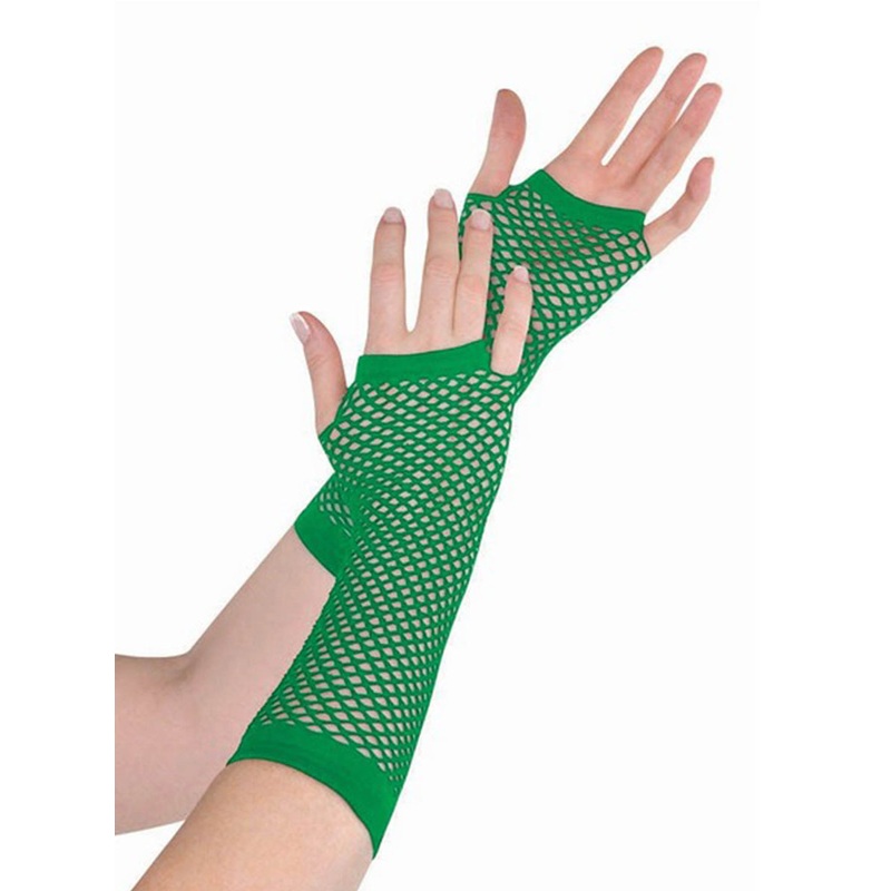 Long Green Fishnet GlovesIncludes:GlovesDescription:Green fishnet gloves are mid arm length.Gloves are fingerless with side openings for the thumb and pinky finger.Features green bands at the top and bottom edges.One size fits most.Fishnet gloves styling t