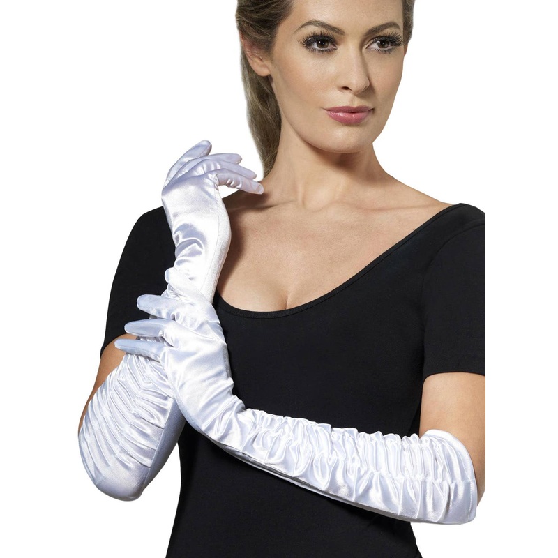 Long White Costume GlovesComplete your fancy dress costume with a pair of long ruched white satin gloves. These elegant costume gloves are perfect for adding a touch of 1920s flapper or Hollywood glamour to your outfit!Description:Gloves are made from whit