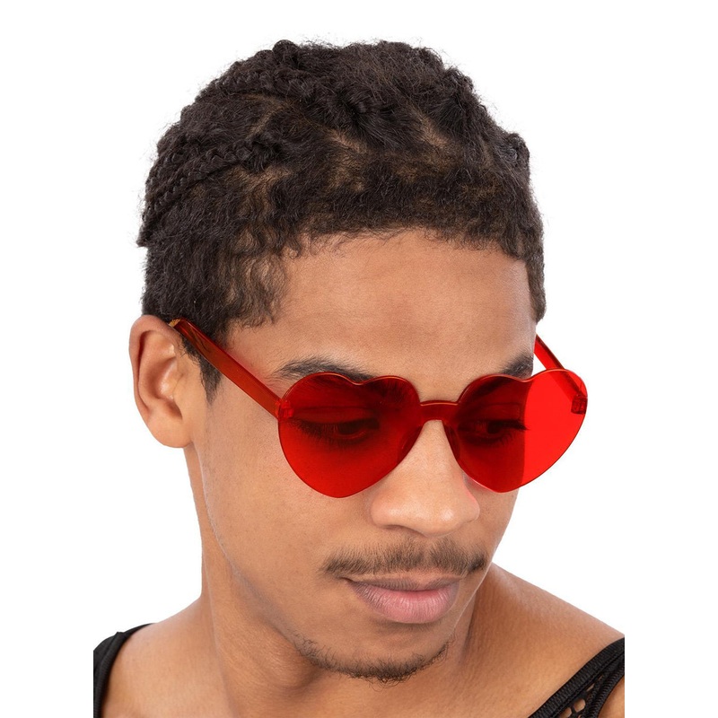 Mens Red Love Heart Costume GlassesIncludes:GlassesDescription:Glasses are made from red tinted plastic.The lenses are shaped like hearts.One size fits most.Red heart glasses tips:Wear these love heart glasses with a bright coloured shirt and a peace sign