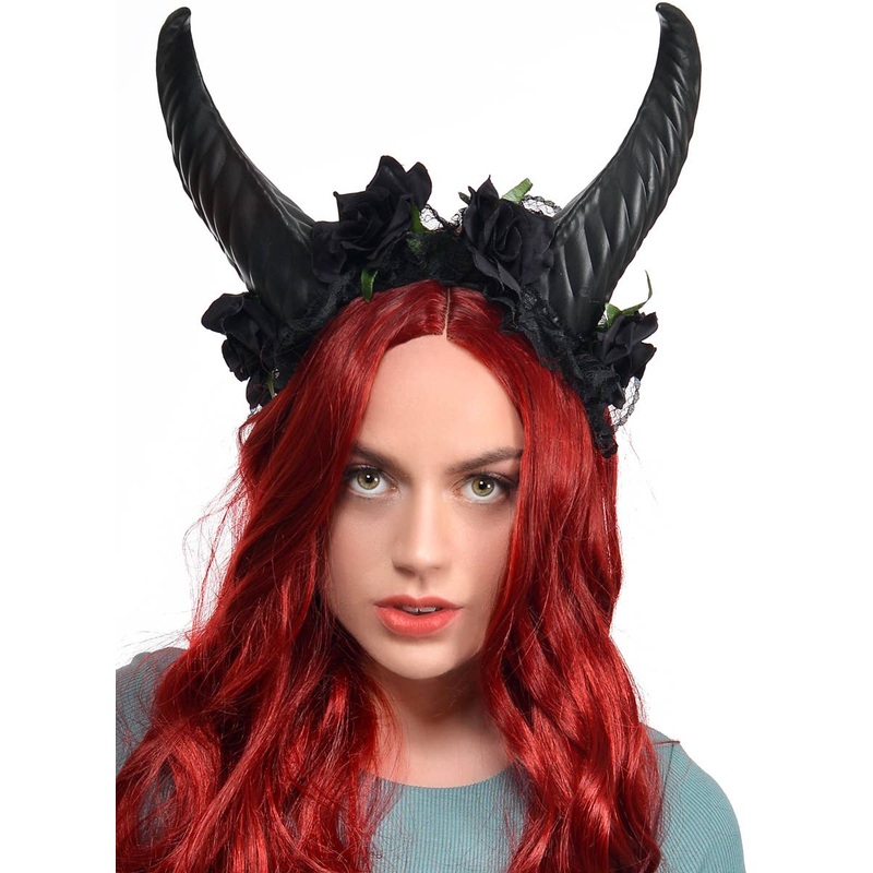Black Maleficent Horns Headband with RosesTake a trip topside for a Halloween party wearing your best set of horns. This costume headband is more than just a simple set of twisted black plastic devil horns. There are black roses and lace attached along the