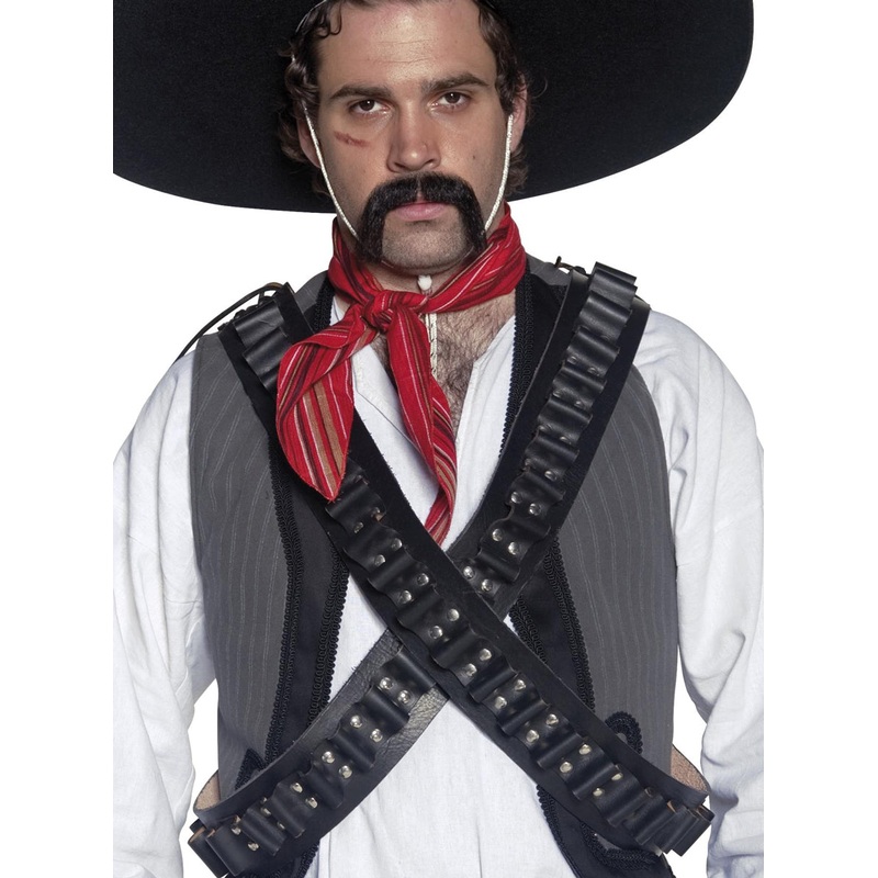 Adults Mexican Bandit Bullet BeltsIncludes:BeltsPlease note: hat, moustache and costume are not included.Description:Bullet belts are made from black faux leather material.All over the front is an extra piece of faux leather with silver studs to create a s