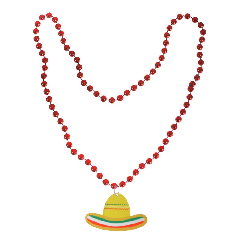 Mexican Beaded Necklace with SombreroDescription:Mexican red beaded necklace features one yellow sombrero with green, white and red details.Necklace measures approximately 38cm long.One size fits most.