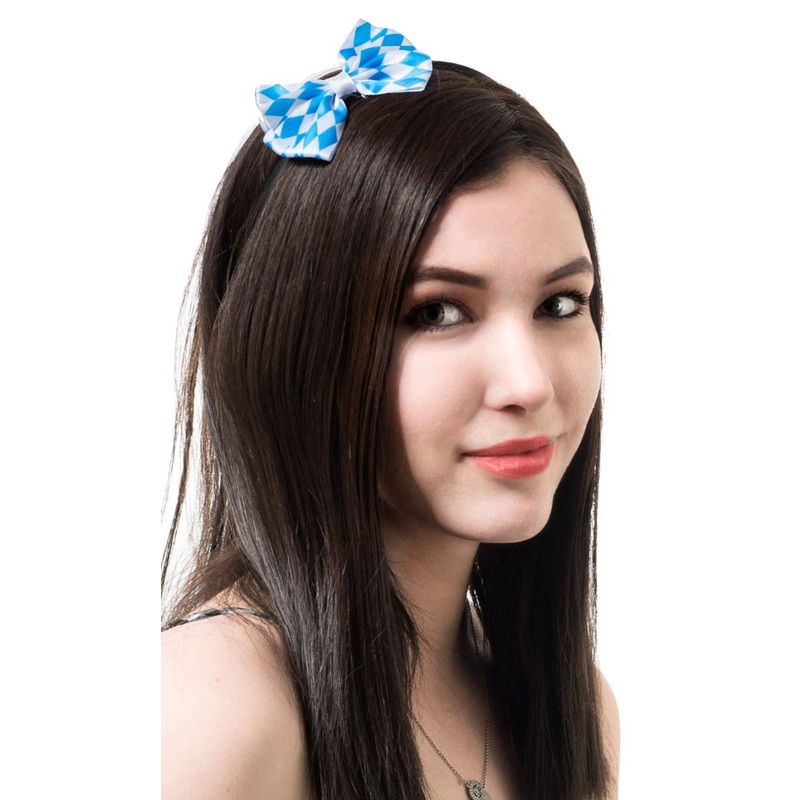 Blue and White Mini Oktoberfest Bow HeadbandGet ready to rock your Oktoberfest costume with the ultimate finishing touch! This super-cute blue and white bow headband will transform your classic dirndl costume!Description:Headband is made from thin black pl