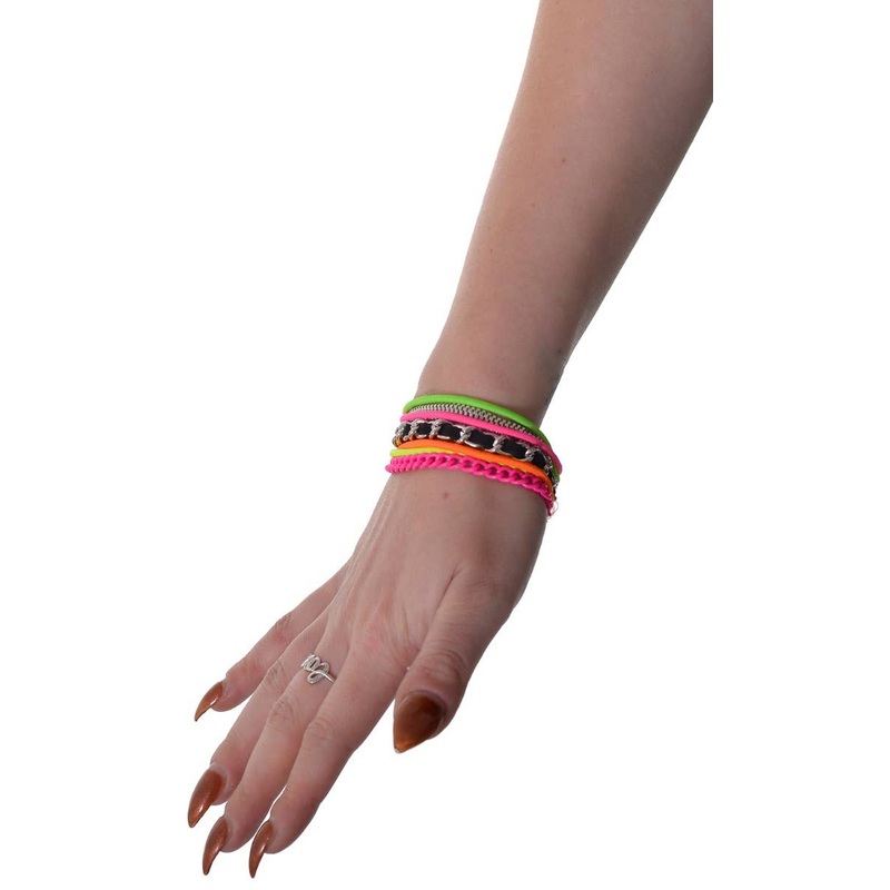 1980s Neon Multiple Stranded Costume BraceletTurn back time and take your 1980s outfit to the next level with this bold multiple stranded neon costume bracelet! Mixing bright colours with silver and black, this costume jewellery is sure to make you stand o