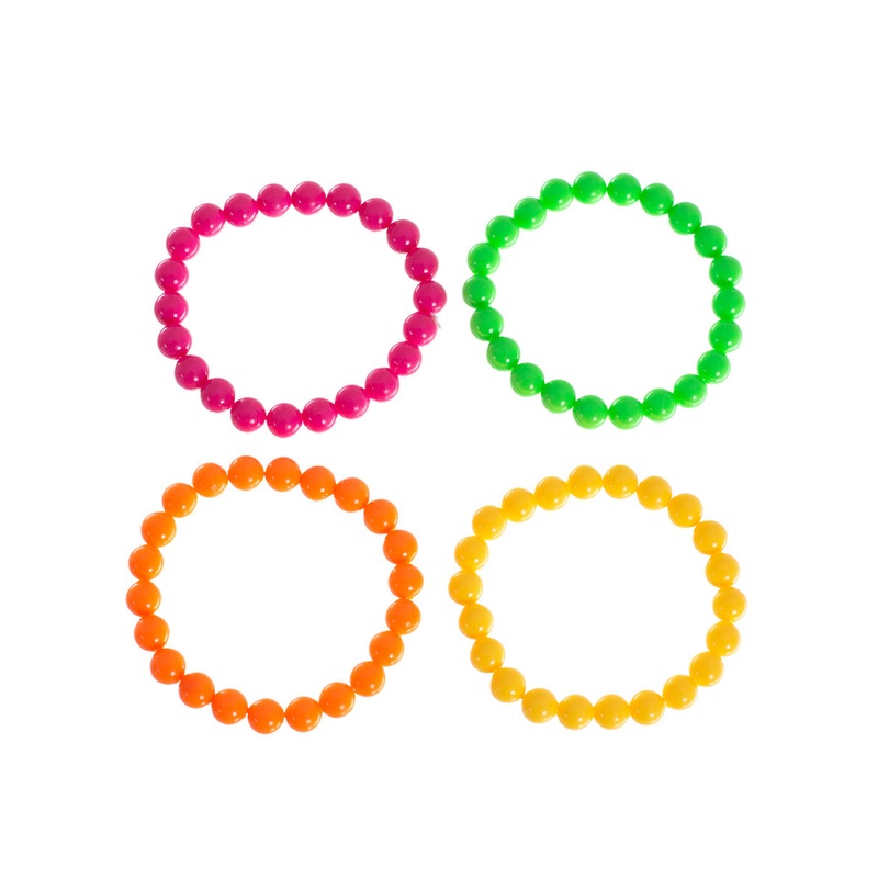 Pack of 4 80s Beaded BraceletsYou can always add some jewellery to your 80s outfits and why not these super cool and bright beaded bracelets! With this 4 pack you can share with your friends or wear them yourself! This costume jewellery also glows under a