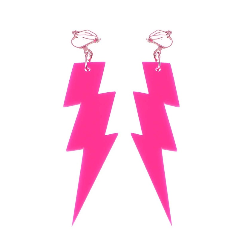 80s Lightning Bolt Neon Pink EarringsFinish off your 1980s outfit with these neon pink clip on earrings! This costume jewellery is sure to turn heads at yours 80s fancy dress party! Pair them with some other neon coloured accessories and you'll be sure to