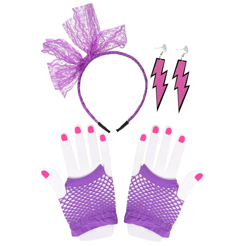 3 Piece 1980's Purple Neon Costume Accessory SetHurry up and bring your jukebox money! We're heading to the love shack! Transform into a 1980's babe with this incredible 3 piece accessory set! Sing and dance all night long while you relive the good old day