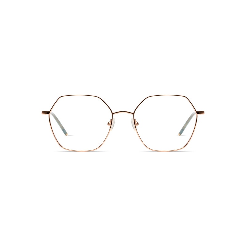 Always has two colored fronts and two acetate fronts. Two classical colors and two contrasting colors. Always combined with a metal color. Classical hexagonal shape.
