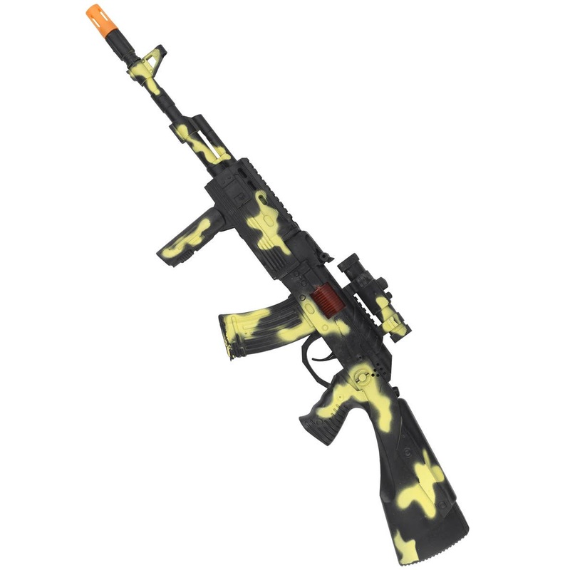 Fake Automatic Rifle Toy GunDescription:Plastic black toy military style gun.Gun features yellow spray painted patches all over to resemble camo print.When the trigger is pulled, the front section moves back and forth and makes noise.This novelty gun measu
