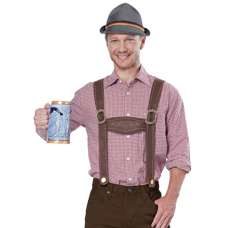 Get the beer ready, fire up some yodelling vocals and have a Guten Tag at your next Oktoberfest costume event, wearing this men’s Bavarian fancy dress kit by California Costumes! With a stein in one hand and this men’s German Lederhosen kit, you’re sure to look like an authentic slap-dancer! This men’s brown Lederhosen braces paired with the grey German fedora are perfect to get dressed up for Oktoberfest!