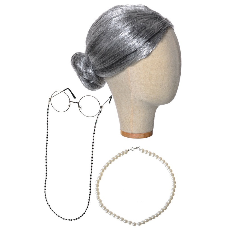 Girls Oldy Lady Costume Accessory KitCelebrate 100 days of schools with this super cute old lady costume kit! This costume kit comes with a wig, necklace and glasses, making it perfect for your celebration! Just don't forget to grab your walking stick!Incl