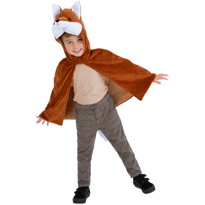 Boys Brown Plush Fox Costume CapeIncludes:CapePlease note: top, pants and shoes are not included.Description:Cape is made from brown material and has a darker brown lining on the inside.Attached is a hood with a plush fox face including ears, eyes, mouth a