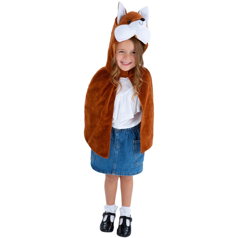 Girls Brown Plush Fox Costume CapeIncludes:CapePlease note: top, skirt and shoes are not included.Description:Cape is made from brown material and has a darker brown lining on the inside.Attached is a hood with a plush fox face including ears, eyes, mouth