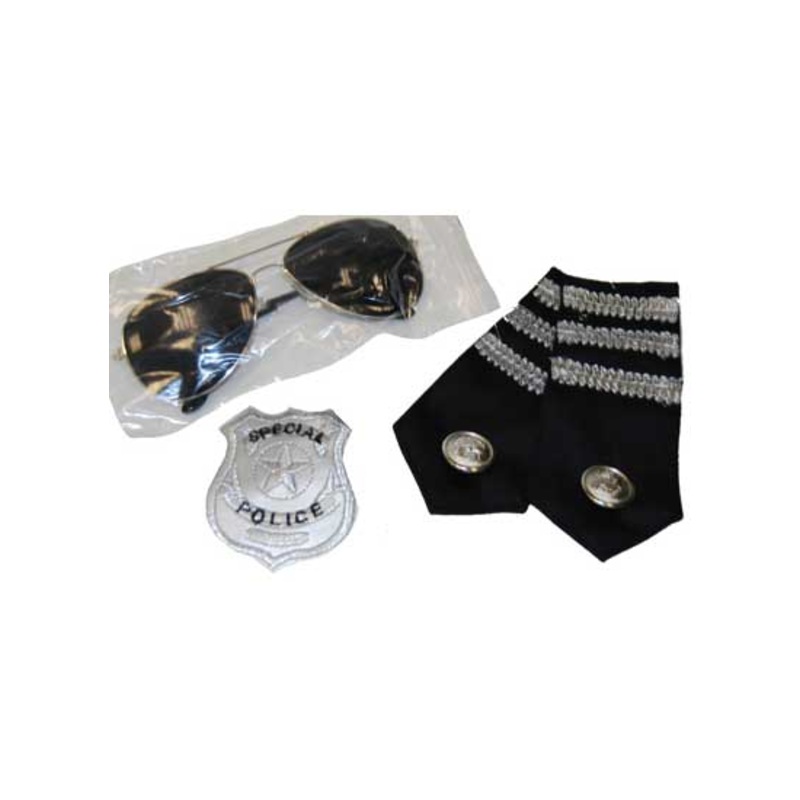 Cop Costume Dress Up SetThis cop costume accessory set comes with a badge, glasses and epaulets! Make sure you top off you police officer, detective or military themed fancy dress costumes with these fun novelty cop accessories.Description:One pair of avia