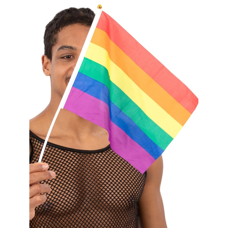 Pack of 12 Hand Held Pride FlagIncludes:12 flagsDescription:Multicoloured rainbow flag.Rainbow flag features horizonal stripes.Flag is attached to a white pole with gold round cap on top. Pride flags measures approximately 30x45 cm.Pride flag tips:Grab thi