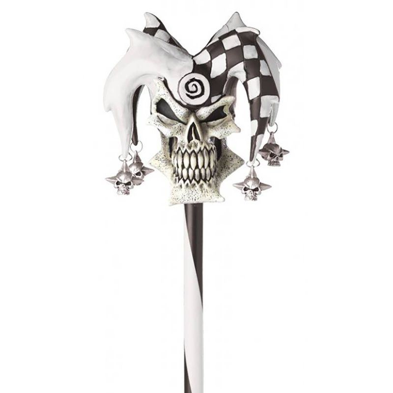 • The top of the cane has a black and white evil looking skull with red and black jesters hat.