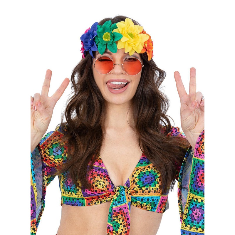 Rainbow Flower Crown 60s HeadbandIncludes:HeadbandPlease note: glasses and top are not included.Description:Flower crown is made up of multicoloured faux flowers.Flowers are attached to an elastic band.Hippie headband styling tips:This flower crown will lo