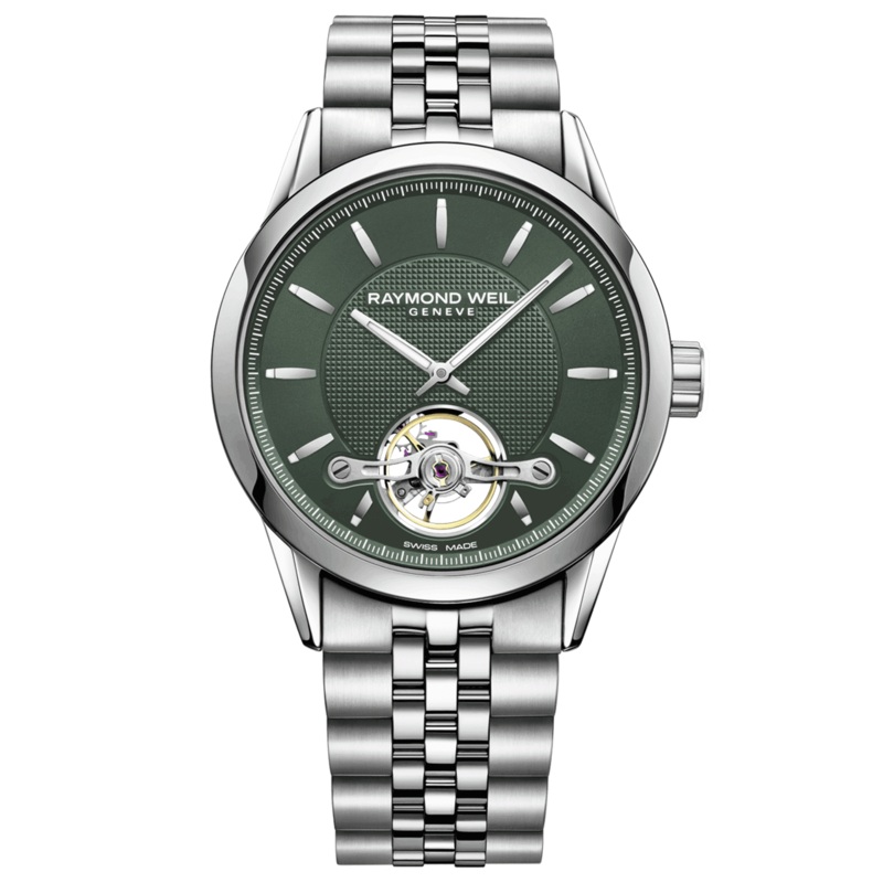 The balance-and-spring assembly is the focus of attention of thisfreelancerCalibre RW1212 black steel bracelet watch, framed by a 42.5 mm case. The diamond-polished balance wheel and skeletonized bridges ensure transparent visibility extending to the very heart of the watch. Powered by a mechanical self-winding movement, thefreelancerCalibre RW1212 beats at a frequency of 28,800 vibrations per hour and has a 38-hour power reserve.