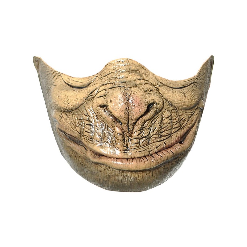 • The mask has a brown white base with textured fur and skin shadowing throughout.