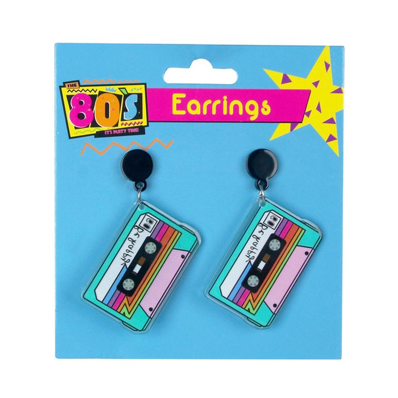 1980s Cassette Tape Costume EarringsIncludes:EarringsDescription:Stud style earrings with a clear backing for pierced ears.Earrings have a black circle stud front.Attached to the stud is a cassette tape.Cassette tape has "Be happy" in black font on top and