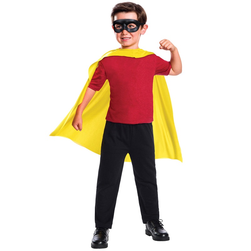 Boys DC Comics Robin Mask and Cape SetIncludes:MaskCapePlease note: top, pants and shoes are not included.Description:Black eye mask is made from EVA plastic.Mask has two eye holes and an elastic strap on the back.Cape is made from yellow polyester and has