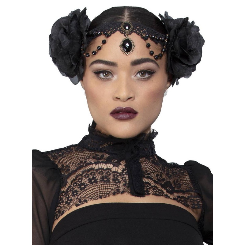 Deluxe Rose Embellished Costume HeadpieceSometimes your Halloween costume just needs some extra pizazz, and this rose embellished headpiece will certainly do just that! This stunning black rose headpiece with jewels is a great costume accessory to add that