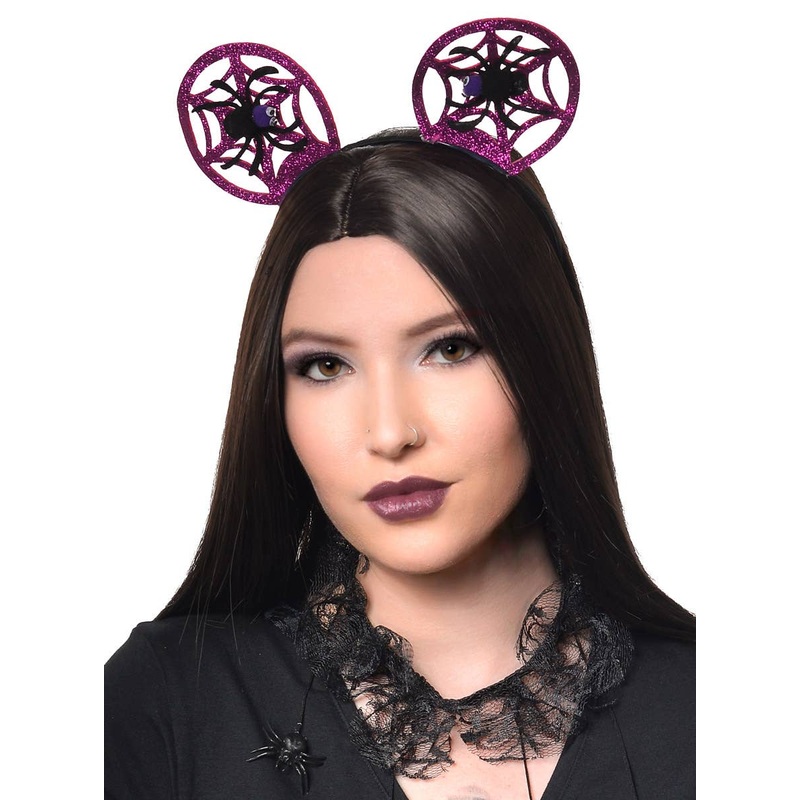 Pink Glitter Costume Ears with Spider and Web DetailsThese unique Halloween ears feature a glittery pink spiderweb design with a small spider perched in the center. They are made of high-quality materials and are very comfortable to wear. The costume headb